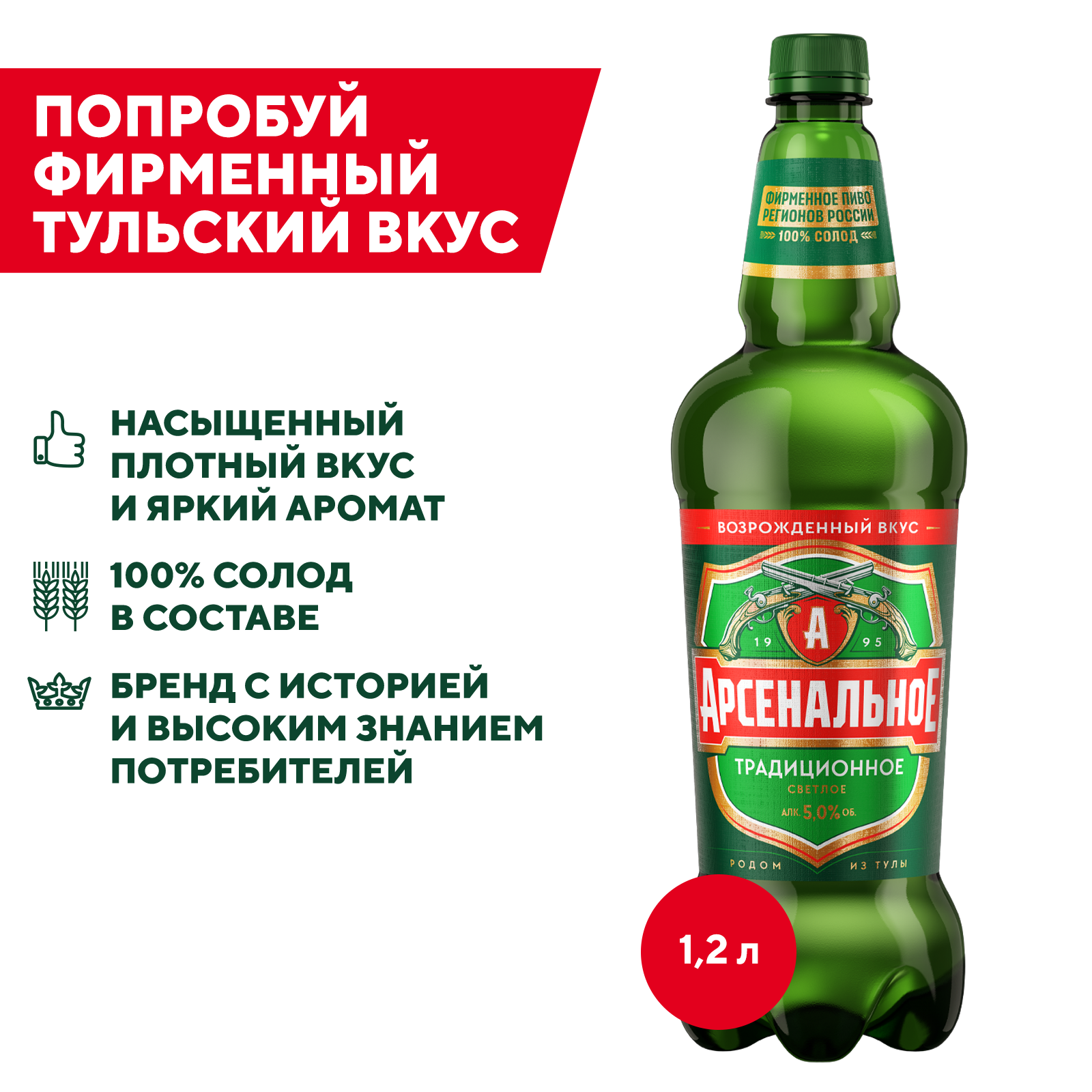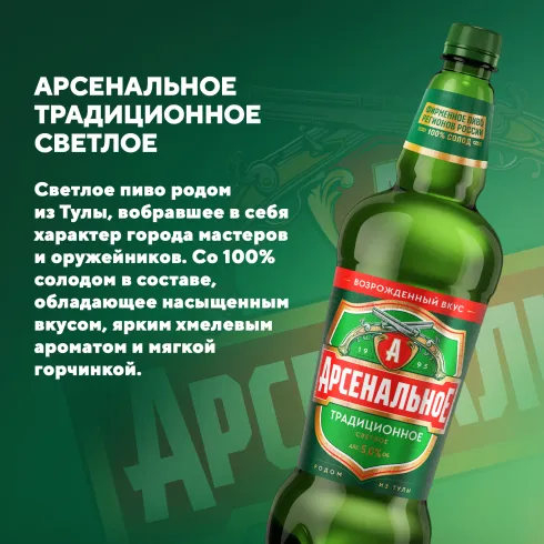 Приобретите Арсенальное Традиционное Светлое уже сегодня и насладитесь качественным пивом, которое подойдёт для любого повода!"
