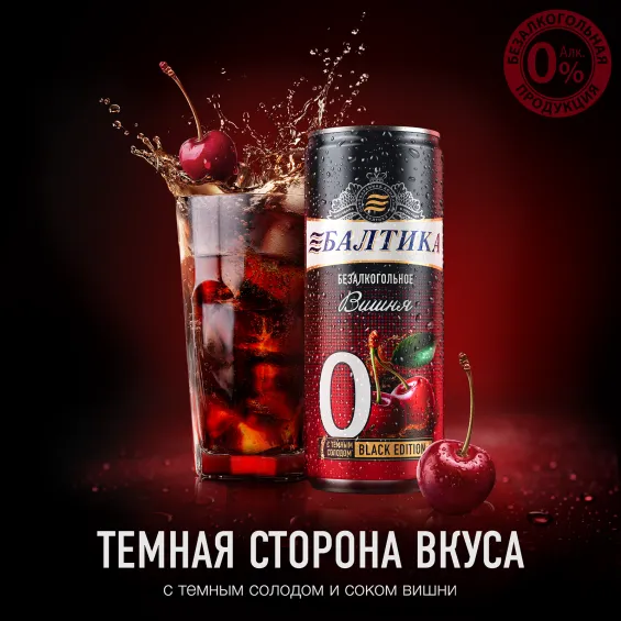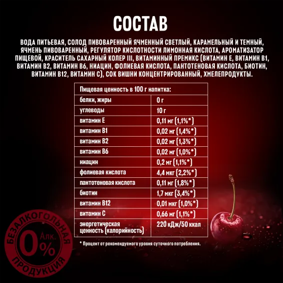 вода питьевая, солод пивоваренный ячменный светлый, карамельный и темный, ячмень пивоваренный, регулятор кислотности лимонная кислота, ароматизатор пищевой, краситель сахарный колер III, витаминный премикс (витамин Е, витамин В1, витамин В2, витамин В6, ниацин, фолиевая кислота, пантотеновая кислота, биотин, витамин В12, витамин С), сок вишни концентрированный, хмелепродукты