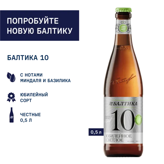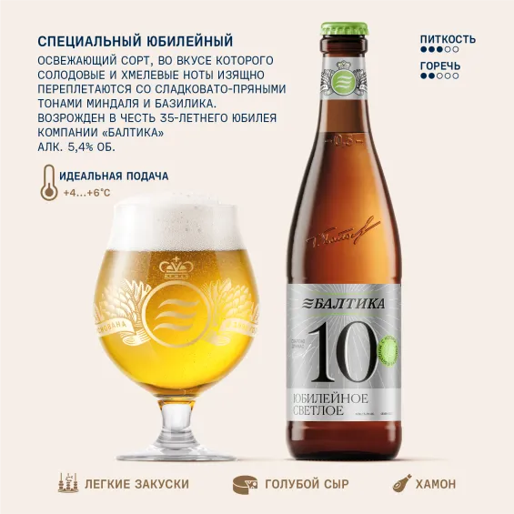 Балтика №10 Юбилейное - достаточно насыщенный и при этом освежающий светлый лагер, во вкусе которого подробнееБалтика №10 Юбилейное - достаточно насыщенный и при этом освежающий светлый лагер, во вкусе которого солодовые и хмелевые ноты изящно переплетаются со сладковато-пряными тонами миндаля и базилика. Сочетание умеренной сладости марципана и свежести базилика в аромате пробуждает аппетит и обещает интересное гастрономическое приключение."