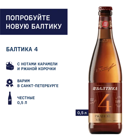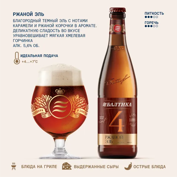 Балтика №4 – благородный эль с нотами карамели и ржаной корочки в аромате. Деликатную сладость во подробнееБалтика №4 – благородный эль с нотами карамели и ржаной корочки в аромате. Деликатную сладость во вкусе уравновешивает мягкая хмелевая горчинка.