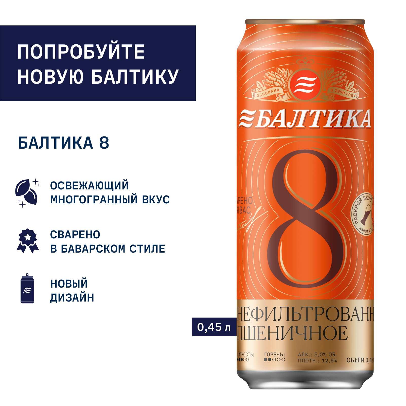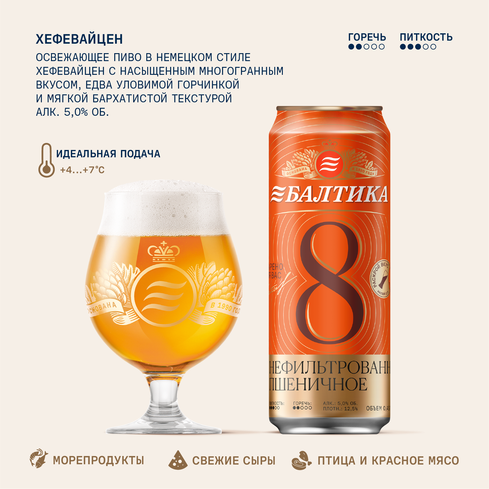 Балтика 8 - это пшеничное нефильтрованное пиво с насыщенным многогранным вкусом, едва уловимой горчинкой и мягкой бархатистой текстурой.