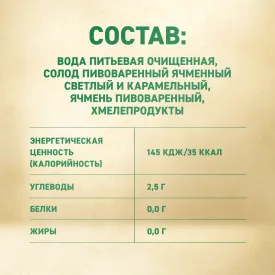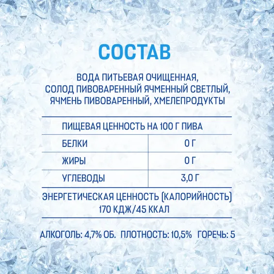 вода питьевая очищенная, солод пивоваренный ячменный светлый, ячмень пивоваренный, хмелепродукты.