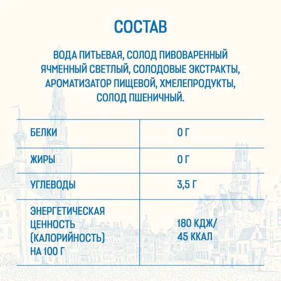 Вода питьевая, солод пивоваренный ячменный светлый, солодовые экстракты, ароматизатор пищевой, хмелепродукты, солод пшеничный