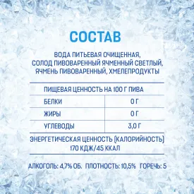 Вода питьевая очищенная, солод ячменный светлый, ячмень пивоваренный, солодовый экстракт, хмелепродукты.
