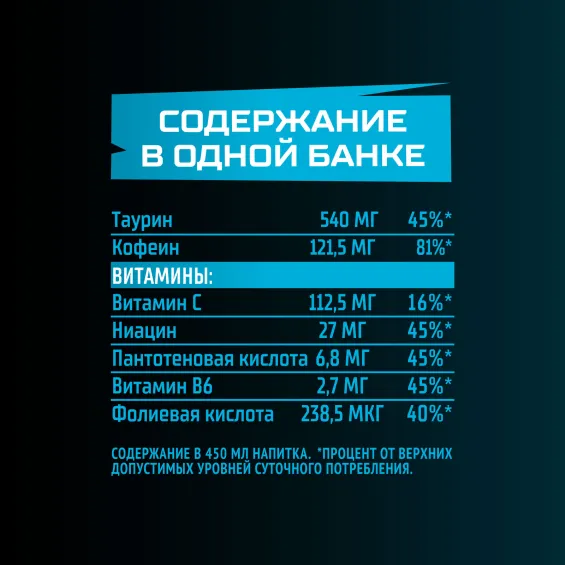 Вода питьевая очищенная, сахар, вкусо-ароматическая основа «Энергия» (таурин, ароматизатор, антиокислитель аскорбиновая кислота, кофеин, краситель Е150d, ниацин, пантотеновая кислота, витамин В6, красители: рибофлавин и жёлтый хинолиновый, фолиевая кислота), регулятор кислотности кислота лимонная, консерванты: сорбат калия и бензоат натрия