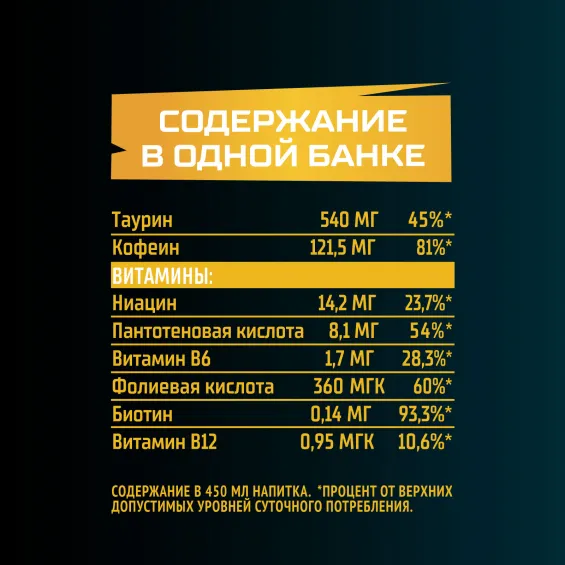 вода питьевая очищенная, сахар, регуляторы кислотности: кислота лимонная и цитрат натрия, ароматизатор пищевой «Манго» (стабилизаторы: E414, E445, антиокислители: E306, E304, красители: E160e, E160a), таурин, ароматизатор пищевой «Ананас» (антиокислитель E307), ароматизатор пищевой натуральный «Тип манго», кофеин, премикс витаминный (ниацин, пантотеновая кислота, витамин B6, фолиевая кислота, биотин, витамин B12), антиокислитель – аскорбиновая кислота, консервант – бензоат натрия.