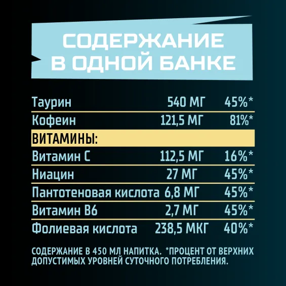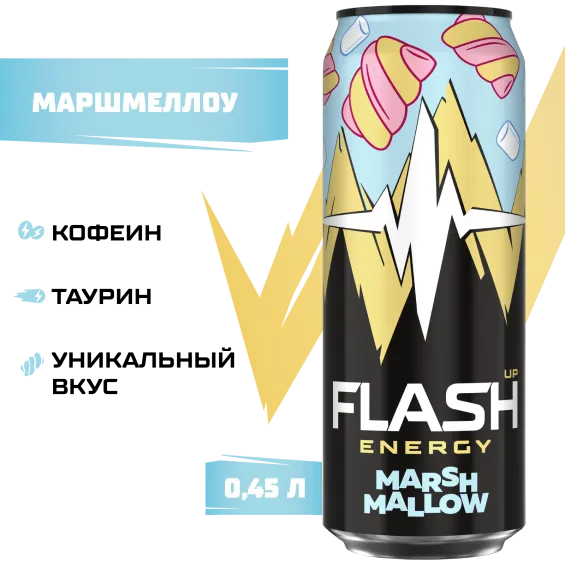 вода питьевая очищенная, сахар, регулятор кислотности лимонная кислота, концентрат для напитков «Энерджимикс» (таурин, витамин С, мальтодекстрин, кофеин, ниацин, пантотеновая кислота, витамин B6, фолиевая кислота), ароматизатор пищевой «Маршмеллоу», ароматизатор пищевой «Ваниль» (стабилизаторы: Е414, Е444, Е445), подсластители: ацесульфам калия, цикламат натрия, сахаринат натрия, консерванты: сорбат калия и бензоат натрия