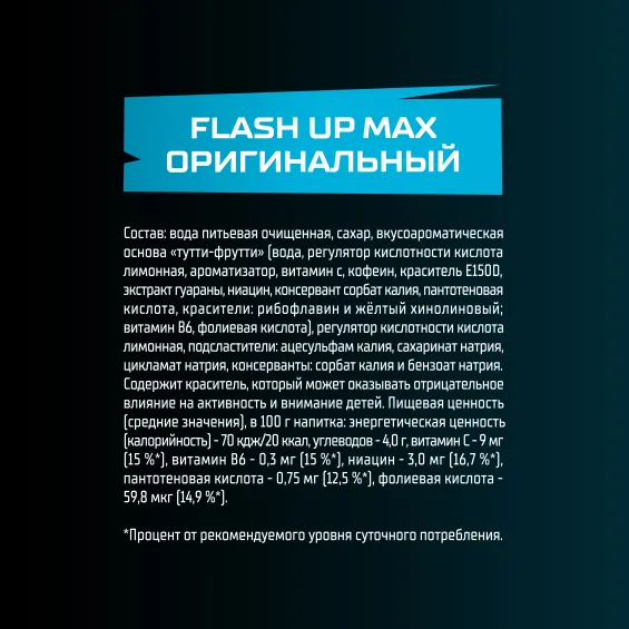 вода питьевая очищенная, сахар, вкусо-ароматическая основа «Тутти-Фрутти» (вода, регулятор кислотности – кислота лимонная, ароматизатор, витамин С, кофеин, краситель – Е150d, экстракт гуараны, ниацин, консервант – сорбат калия, пантотеновая кислота, красители – рибофлавин и жёлтый хинолиновый; витамин В6, фолиевая кислота), регулятор кислотности – кислота лимонная, сладкая пищевая смесь «Мармикс 25» (подсластители: ацесульфам калия, цикламат натрия, сахаринат натрия), консервант – бензоат натрия.