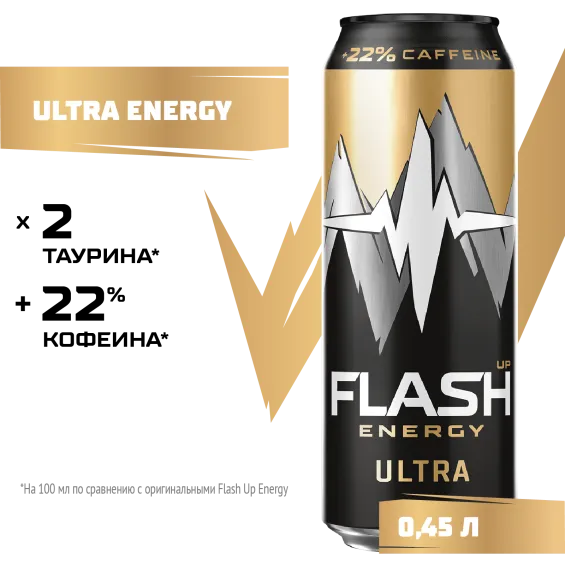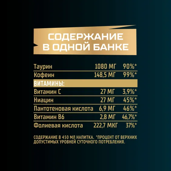 Вода питьевая очищенная, сахар, вкусо-ароматическая основа «Ультра Энергия» (мальтодекстрин, ароматизатор, краситель сахарный колер I простой, кофеин, витамин C, ниацин, пантотеновая кислота, витамин B6, фолиевая кислота), регуляторы кислотности: кислота лимонная и цитрат натрия, таурин, консерванты: сорбат калия и бензоат натрия