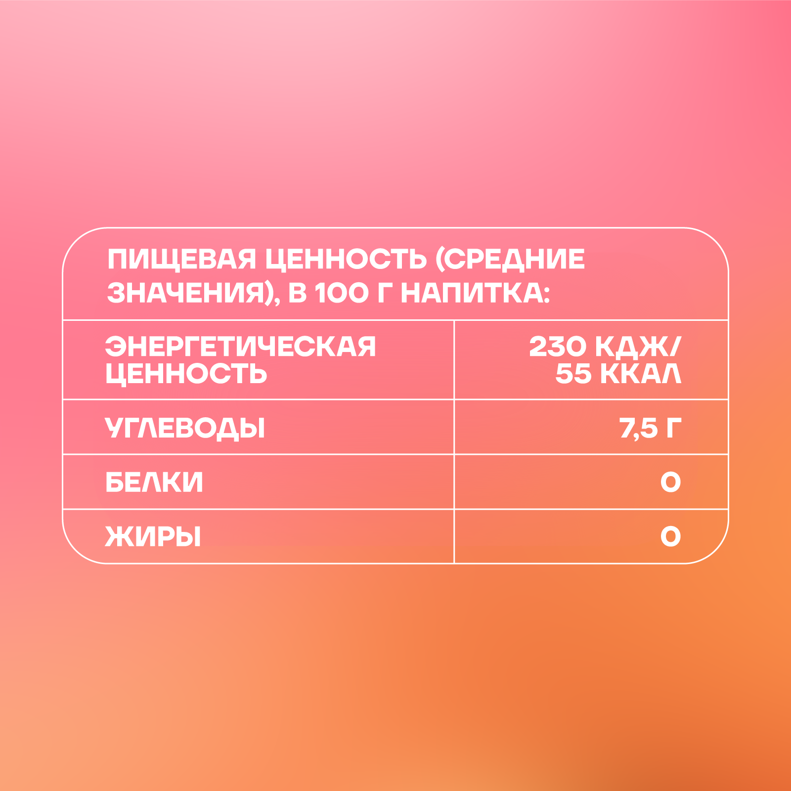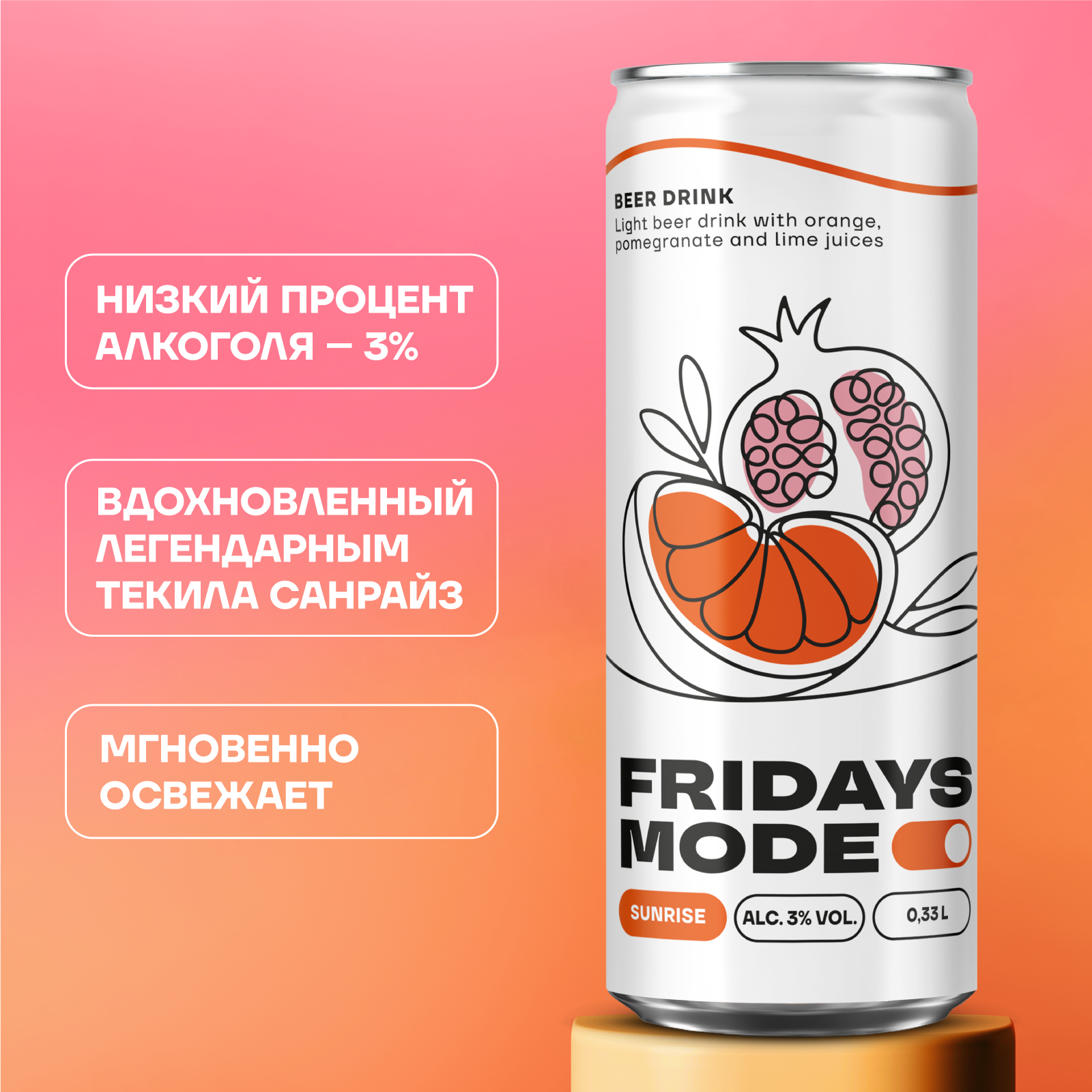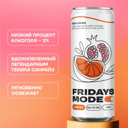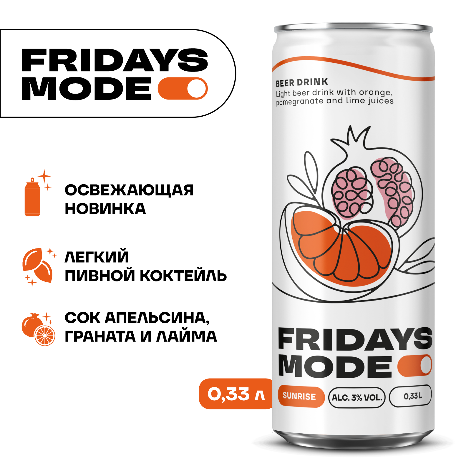 вода питьевая, солод пивоваренный ячменный светлый и карамельный, ячмень пивоваренный, хмелепродукты, регулятор кислотности кислота лимонная, глюкозно-фруктозный сироп, ароматизатор пищевой эмульсионный «Ваниль» (стабилизаторы: E414, E444, E445, регулятор кислотности Е330, консерванты: Е202, Е211), растительный экстракт (сироп глюкозно-фруктозный, вода, экстракт сафлора, регулятор кислотности Е330, консервант Е202), ароматизатор пищевой натуральный «Лимон-Лайм», ароматизатор пищевой «Гранат», ароматизатор пищевой «Апельсин», сок концентрированный из граната, сок концентрированный из апельсина, сок концентрированный из лайма, сок моркови концентрированный.