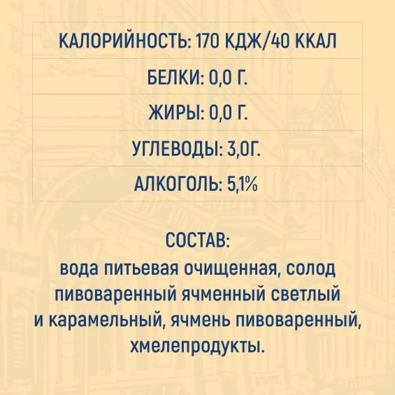 вода питьевая очищенная, солод пивоваренный ячменный светлый и карамельный, хмелепродукты.