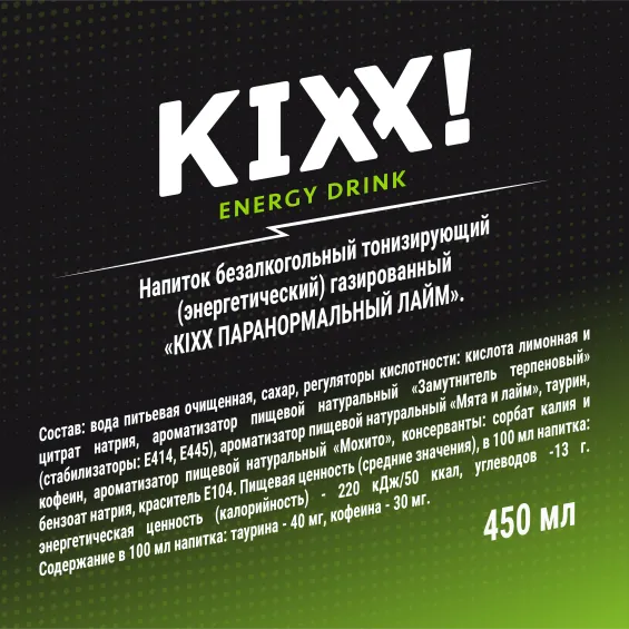 вода питьевая очищенная, сахар, регуляторы кислотности: кислота лимонная и цитрат натрия, ароматизатор пищевой натуральный «Замутнитель терпеновый» (стабилизаторы: Е414, Е445), ароматизатор пищевой натуральный «Мята и лайм», таурин, кофеин, ароматизатор пищевой натуральный «Мохито», консерванты: сорбат калия и бензоат натрия, краситель Е104.