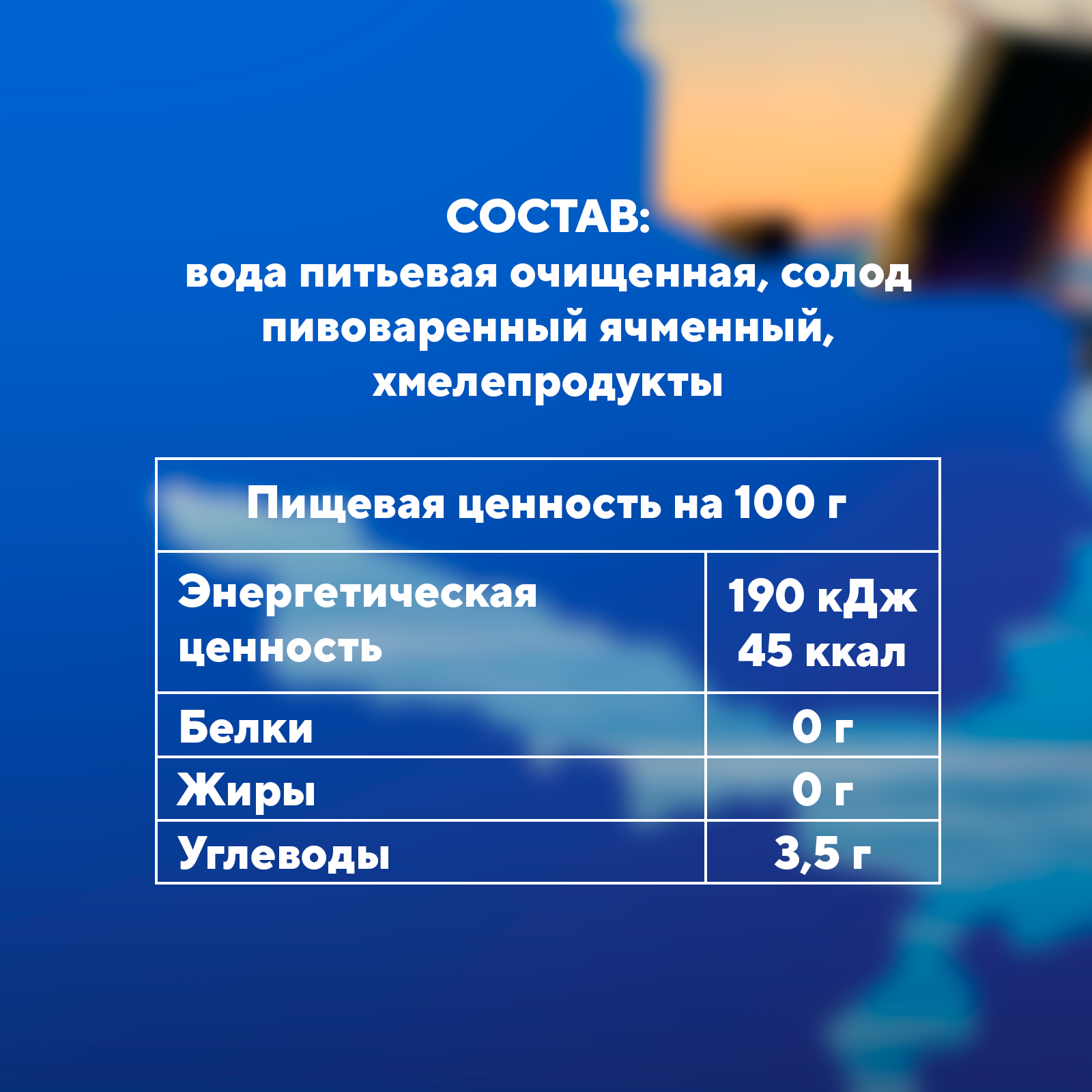вода питьевая очищенная, солод пивоваренный ячменный светлый и карамельный, хмелепродукты.