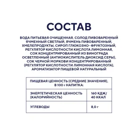 Вода питьевая очищенная, солод ячменный светлый, ячмень пивоваренный, хмелепродукты, солодовый экстракт.