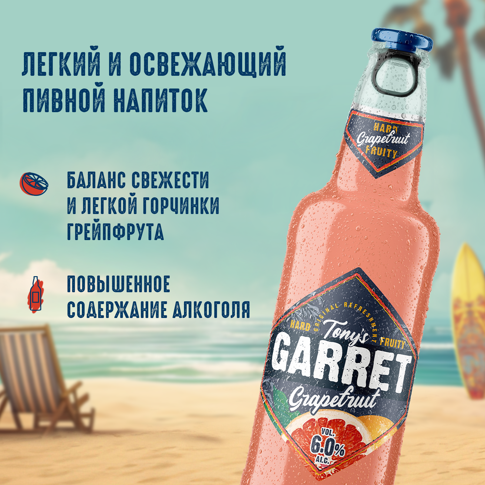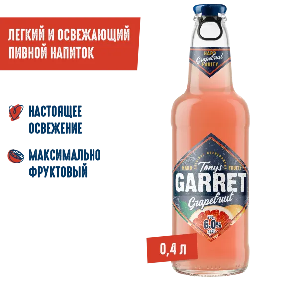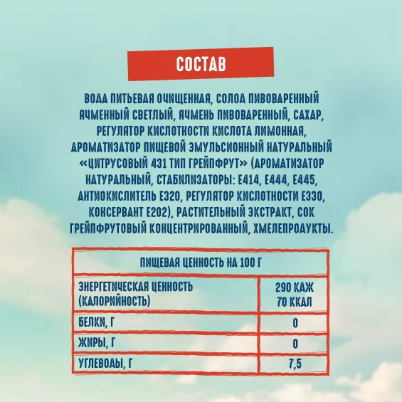 вода питьевая очищенная, солод пивоваренный ячменный светлый, ячмень пивоваренный, сахар, регулятор кислотности кислота лимонная, ароматизатор пищевой эмульсионный натуральный «Цитрусовый 431 тип Грейпфрут» (ароматизатор натуральный, стабилизаторы: E414, E444, E445, антиокислитель Е320, регулятор кислотности Е330, консервант Е202), растительный экстракт, сок грейпфрутовый концентрированный, хмелепродукты.