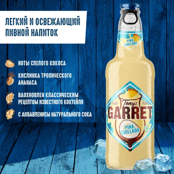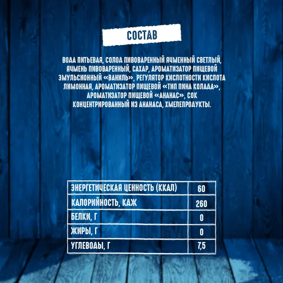 вода питьевая очищенная, солод пивоваренный ячменный светлый, сахар, ароматизатор пищевой эмульсионный «Ваниль» (стабилизаторы: E414, E444, E445, регулятор кислотности Е330, консерванты: Е202, Е211), регулятор кислотности кислота лимонная, ароматизатор пищевой «тип Пина Колада», ароматизатор пищевой «Ананас», сок концентрированный из ананаса, хмелепродукты.