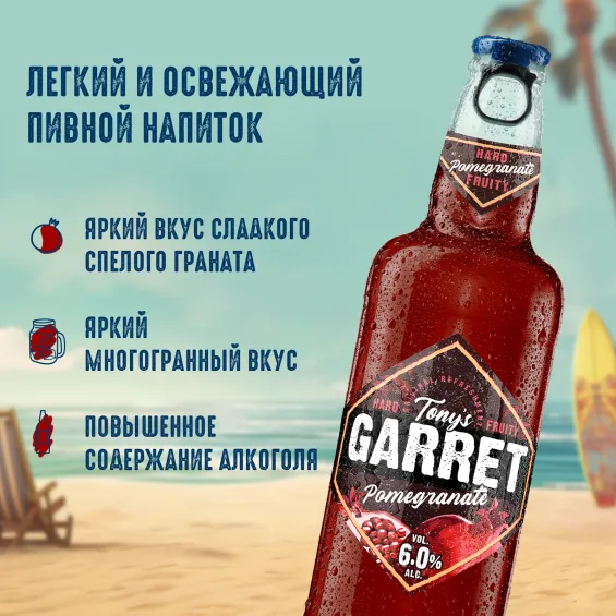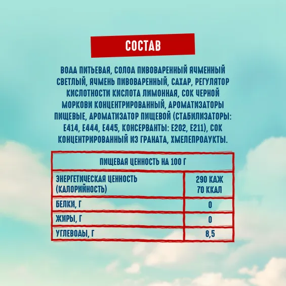 вода питьевая, солод пивоваренный ячменный светлый, ячмень пивоваренный, сахар, регулятор кислотности кислота лимонная, сок черной моркови концентрированный, ароматизаторы пищевые, ароматизатор пищевой (стабилизаторы: E414, E444, E445, консерванты: Е202, Е211), сок концентрированный из граната, хмелепродукты