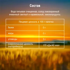 вода питьевая очищенная, солод пивоваренный ячменный светлый и карамельный, хмелепродукты.