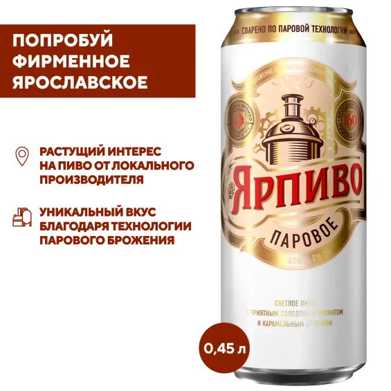 Ярпиво Паровое Банка 0,45 в Воронеже – классическое пиво для повседневного отдыха. Оно сочетает подробнееЯрпиво Паровое Банка 0,45 в Воронеже – классическое пиво для повседневного отдыха. Оно сочетает приятный солодовый вкус и аккуратную хмелевую горчинку, благодаря чему подходит как для самостоятельного употребления, так и в сочетании с закусками. Ярпиво Паровое Банка 0,45 хорошо подходит к мясным блюдам, сырам, снекам и блюдам на гриле. Пиво производится по стандартам пивоваренной компании Балтика с использованием качественных ингредиентов. Купить Ярпиво Паровое Банка 0,45 в Воронеже с самовывозом в фирменном магазине Балтика легко — оформи заказ онлайн и забери его без ожидания доставки.